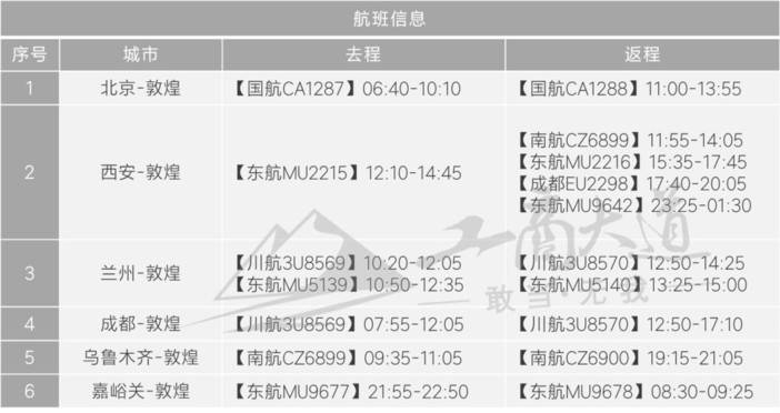 目前队员选择较多的航线是,出发地至西安或兰州,再转机至敦煌,当天抵达。中转请预留足够中转时间,避免前段航班晚点导致无法搭乘后继航班。