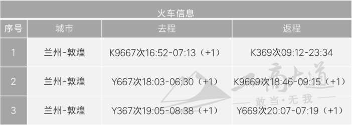 组委会将在敦煌火车站进行接送。目前队员选择较多的火车路线是出发地至兰州,之后搭乘兰州的夜间火车15个小时后到达敦煌市。
