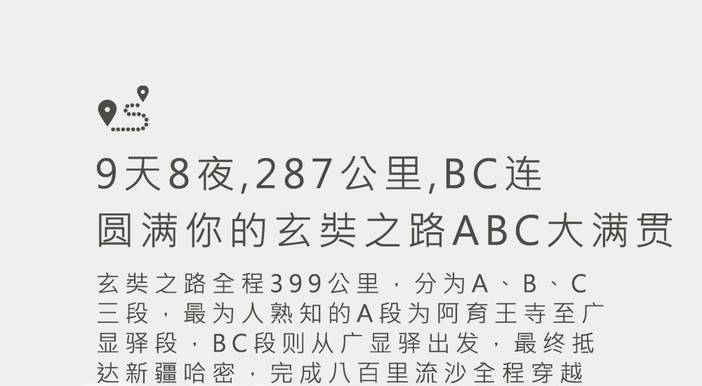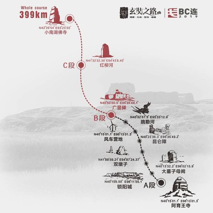 玄奘之路戈壁穿越路段,东南起中国甘肃瓜州境内阿育王寺,西北至新疆哈密小南湖佛寺遗址,全程399公里,共分为A、B、C三段。B段120公里与C段167公里合起来构成了BC连全程。
