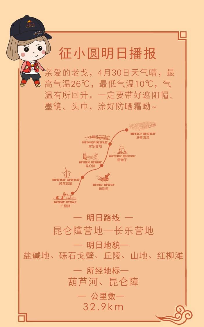 经过第一天的“初体验”,真正的挑战向我们袭来。今天,我们越过深一脚浅一脚的盐碱地,征服一望无际的风车阵,渡过湍流不息的疏勒河,经过汉代长城烽燧雷墩子,最终抵达汉代古城遗址——昆仑障。