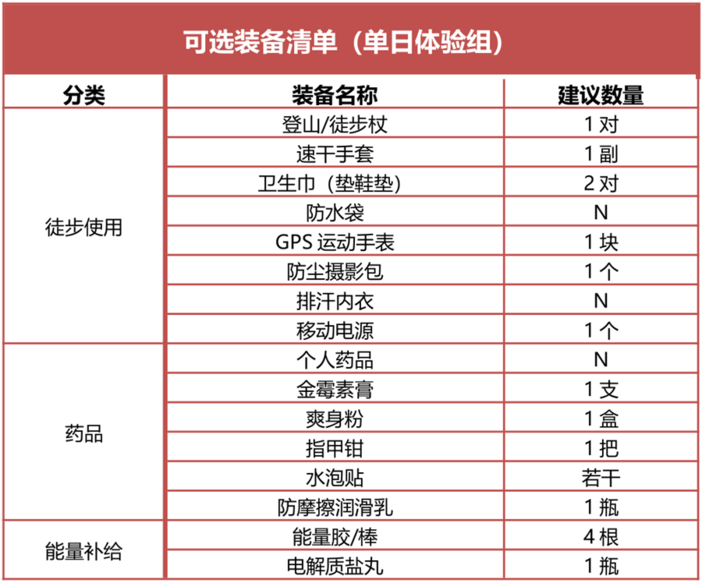 2.单日体验组装备清单