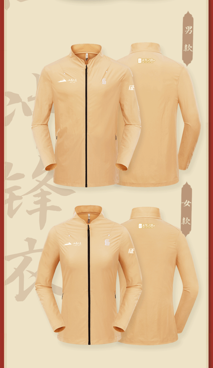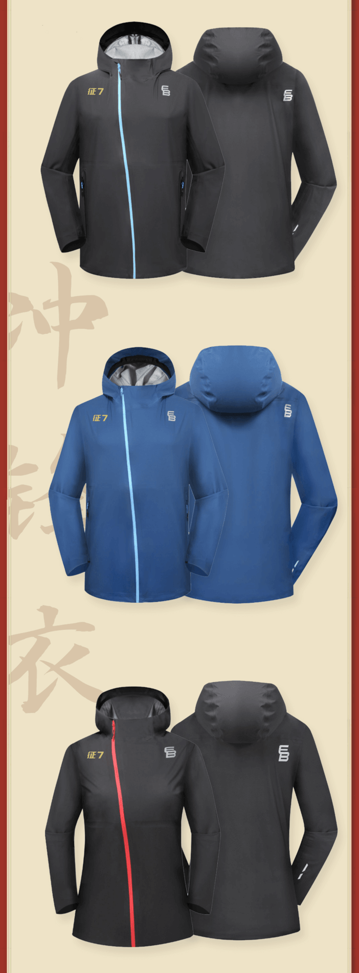 引擎鸟的集超轻防水、防高寒风寒、科技与时尚一体的产品,印有工商大道、玄奘之路以及征7 LOGO。