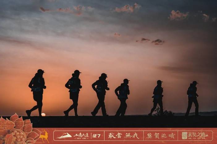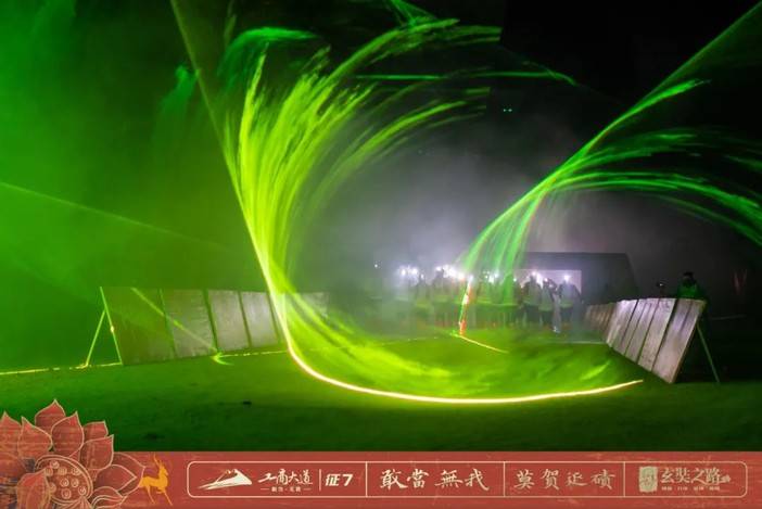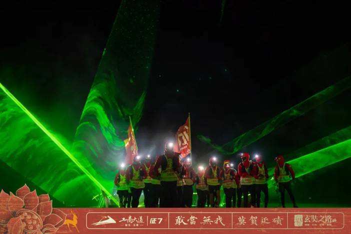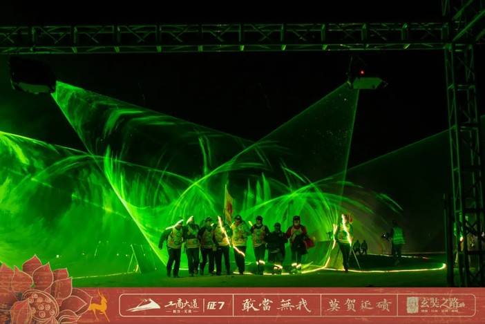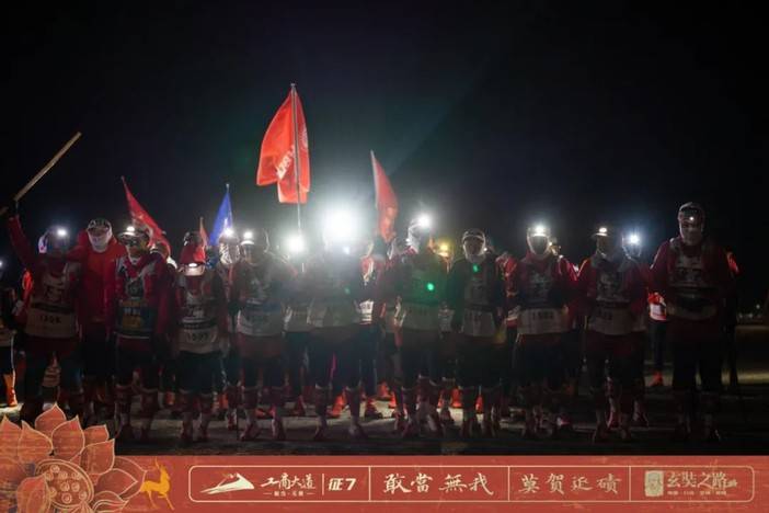 戈友们在早晨五点半集结,一场充满声光视听盛宴的出征仪式过后,在璀璨银河和漫天繁星的夜幕之下,戈友们借助头灯的光辉,踏上29公里的征途,穿越荒滩与绿洲,奔赴终点戈壁清泉。