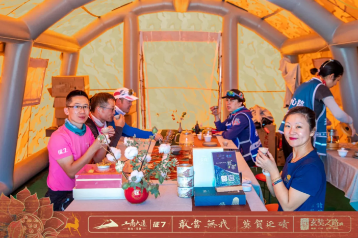 “无我茶室”,洁净纯粹的祁连融雪遇到武夷山大红袍,滋润戈友的心田。帐中备有征赛定制的专属茶具与隐岭、八马提供的戈友专供茶,在茶室与茶友们分享。还有许多戈友自带了茶叶,在这里相聚畅聊当日征途趣事。