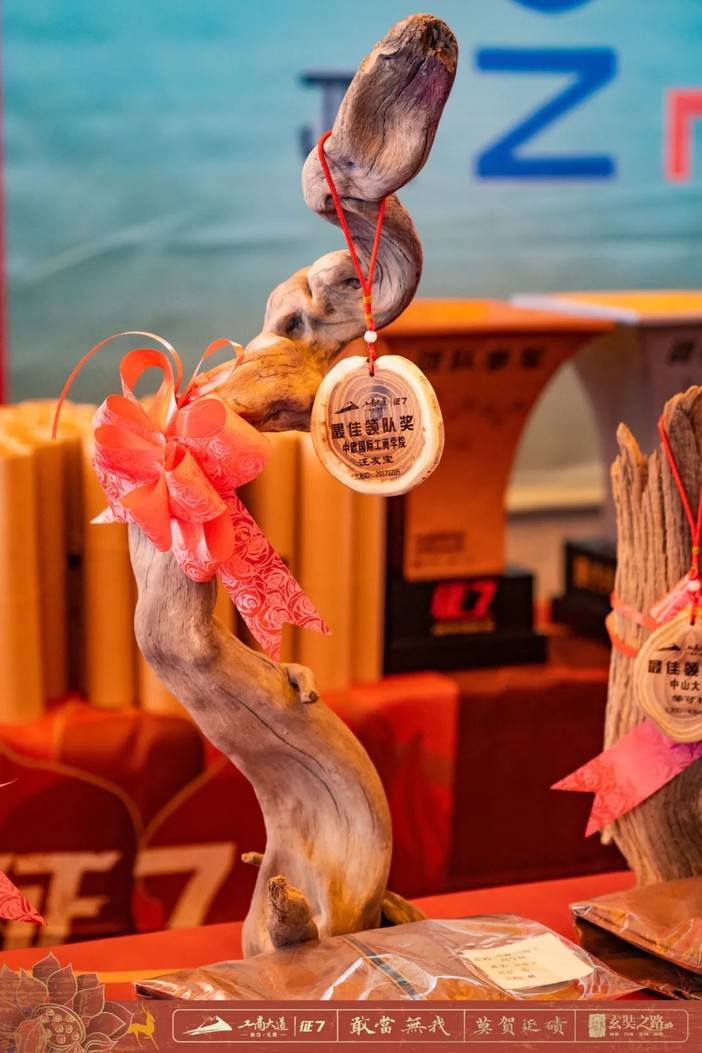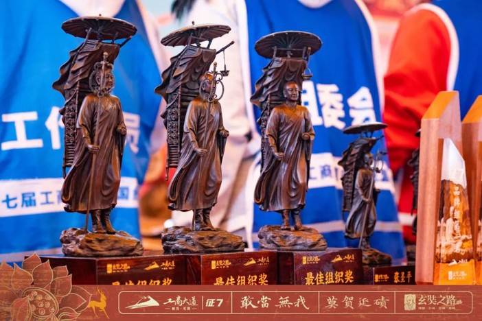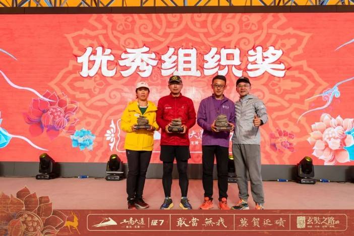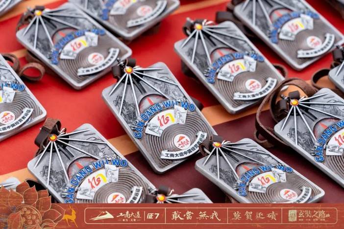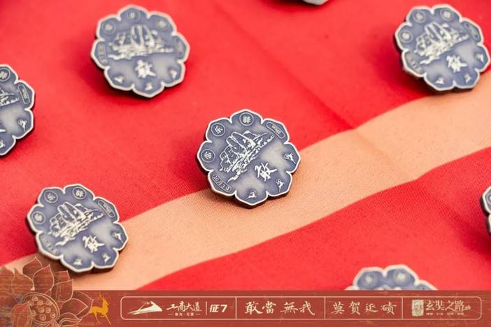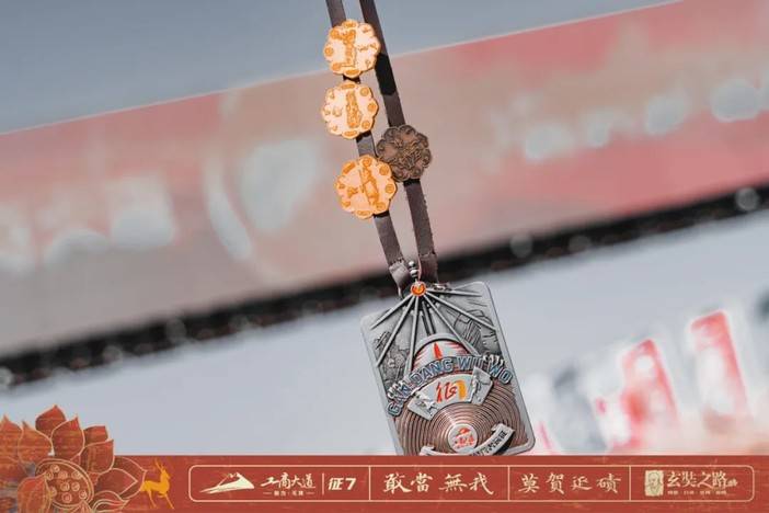 四天日程,每天分别可获得一枚莲花纹饰的“敢”、“当”、“无”、“我”徽章。对应金银铜奖牌榜的时间门槛,每一枚徽章都有金银铜三种颜色,授予在相应时间内完成者。此外,还有体现工商大道核心理念的完成奖牌、用风蚀岩石和胡杨木制作的各类奖杯,以及玄奘法师像,等等。