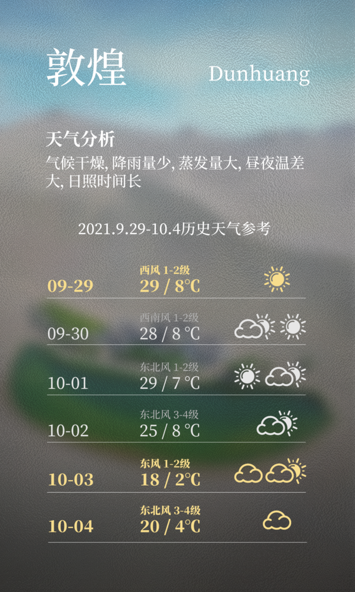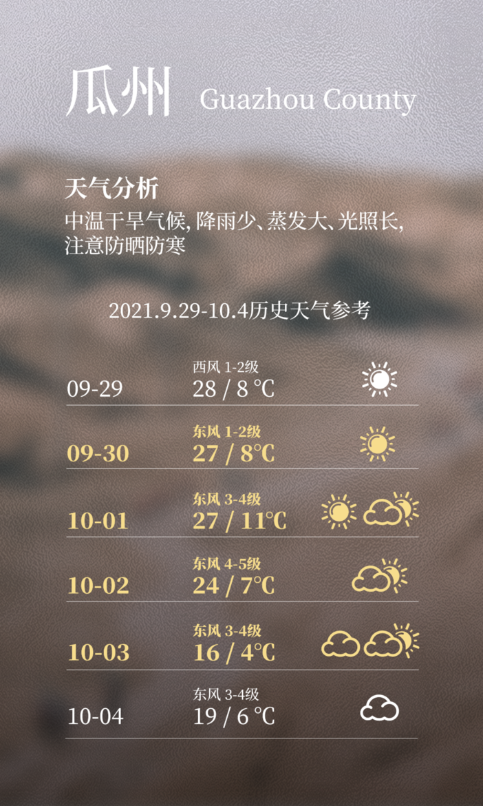 工商大道·征8将于今年9月底10月初如约而至,本篇公告将带各位戈友一起了解赛事期间敦煌以及瓜州的天气情况。