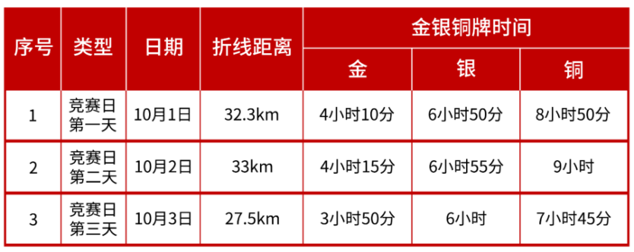 竞赛日第一天(10月1日)减时43分钟,竞赛日第二天(10月2日)减时45分钟,竞赛日第三天(10月3日)减时36分钟。