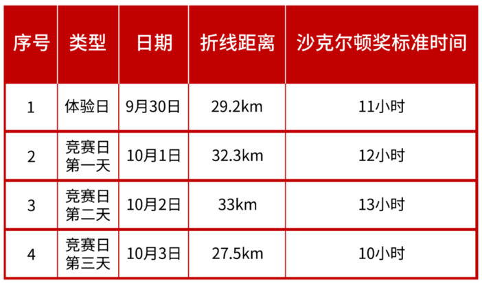 赛事时间为9月29日-10月4日举行。9月30日-10月3日为赛期,共四天,徒步约122km: