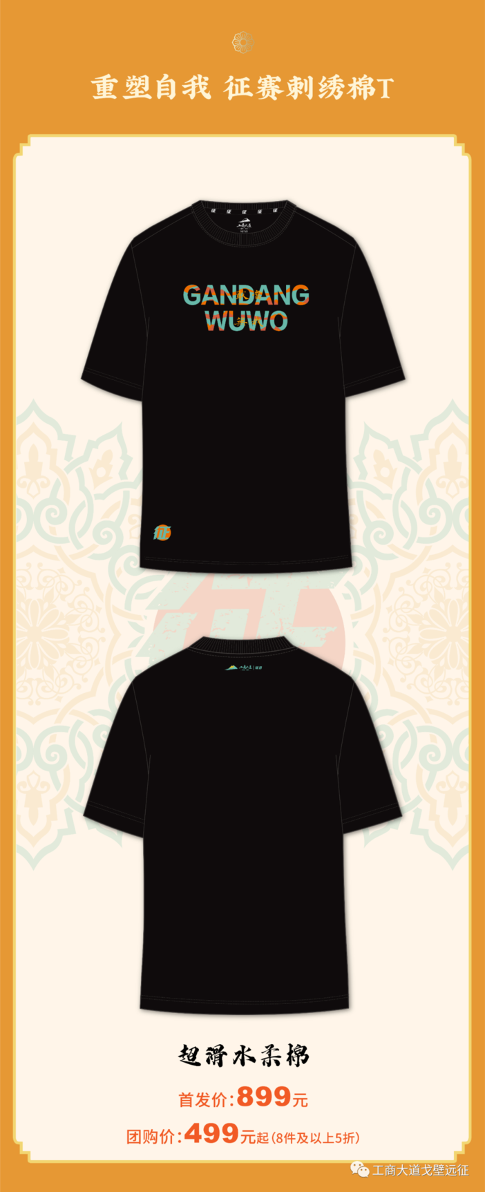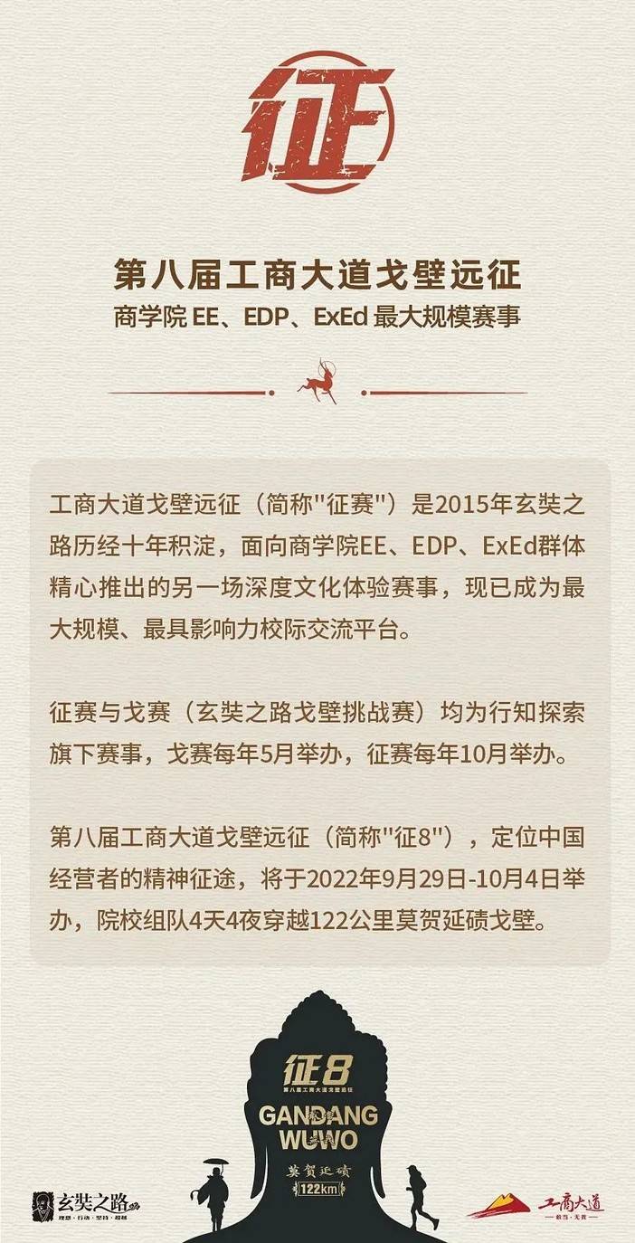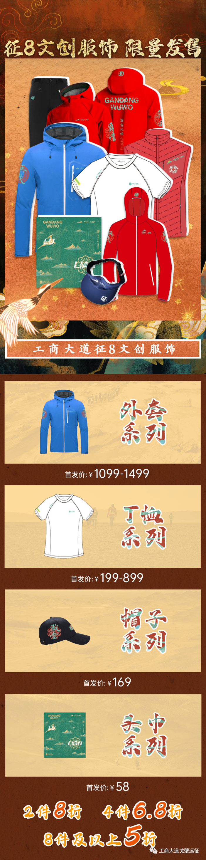 服装统一印制有工商大道·征8全新LOGO,彰显工商大道戈友身份。使用敦煌遗书“写经体”设计的“征”以及“敢当无我”字样,希冀戈友们能够在终点,遇见更美好的自己。
