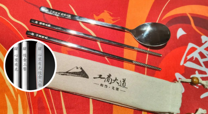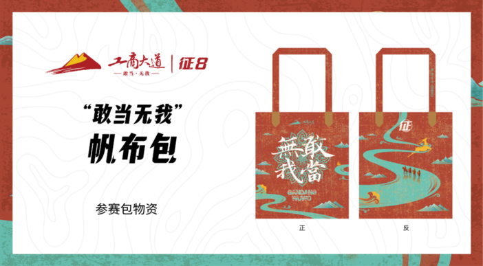 帆布包选用优质帆布材料,颜色取自敦煌壁画,简约大气。包面除了取自敦煌遗书字体的“征”和“敢当无我”。莲花图案作为衬托,寓意未来征途一路莲升,紫气东来。