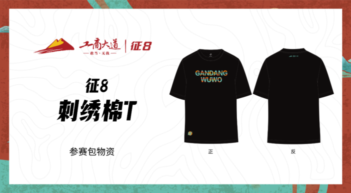 赛T选用超滑水柔棉面料,整体为黑色。正面是取自敦煌遗书字体的“征”以及“敢当无我”英文字样,以刺绣工艺制作,时尚简约。背面衣领印有工商大道全新征8LOGO,彰显戈友身份。