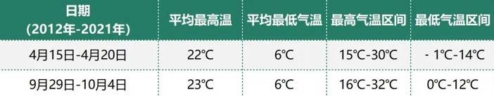 平均最高温度:22℃,平均最低温度:6℃,最高气温区间:15℃-30℃,最低气温区间:-1℃-14℃,月平均降水量:3mm。