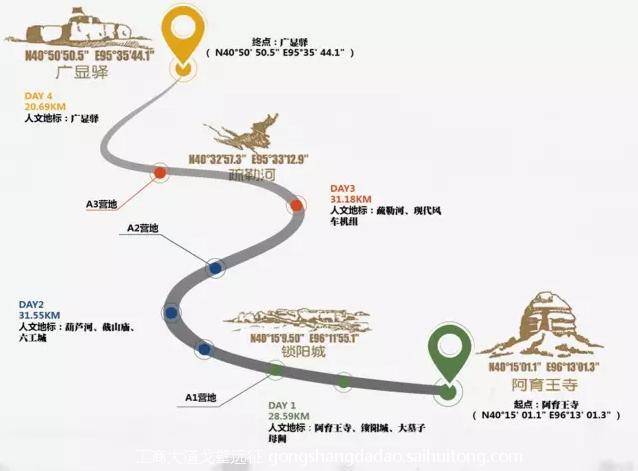 沿途人文地标众多,包括阿育王寺、锁阳城、大墓子母阙、雷墩子、双敦子、广显驿。