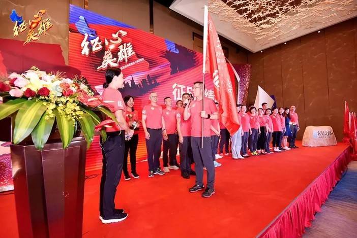 薪火相传,神圣的交旗仪式中,征五队长柯荣富把征六大旗传递给金建春会长,金建春会长隆重地把征六大旗交到新任征六领队苏建锋手中,旗帜飘扬,意气风发,……
